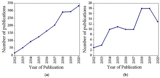 Among the wide variety of nanostructures developed for theranostic purposes, GbMNPs represent a research trend that has attracted increasing attention in the last few years (Figure 2a). However, if the search is narrowed to the keywords (“graphene + magnetic + theranostic” (title/abstract/keywords)) (Figure 2b) we verify that the growth trend continues to exist, but in a more modest and oscillating way.