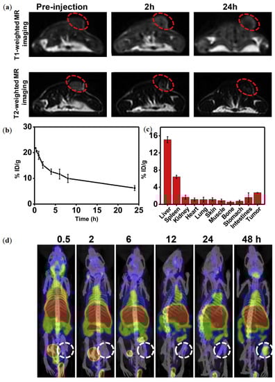 (a) MR imaging of mice treated with RGO-MnFe2O4-PEG nanocomposites; (b,c) in vivo performance of RGO-MnFe2O4-PEG nanocomposites. (b) The blood circulation and, (c) biodistribution of 125I-RGO-MnFe2O4-PEG nanocomposites. (d) SPECT/CT imaging of mice treated with 125I-RGO-MnFe2O4-PEG nanocomposites. Reprinted with permission from ref. []. Copyright 2019 Elsevier.
