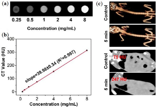 (a) In vitro results from CT using GZUC-PEG at several concentrations. (b) CT value of GZUC-PEG dispersed in aqueous solutions at several concentrations. (c) CT imaging and 3D renderings of CT images of tumor-bearing mice without, i.e., control, and with GZUC-PEG. Reprinted with permission from ref. []. Copyright 2018 American Chemical Society.