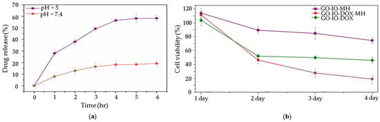 (a) pH dependent release of DOX from GO-IO-DOX over time; (b) effect of repeated periodic hyperthermia (15 min/24 h) on the CT26 cell line, used as cancer model. Reprinted from ref. [].