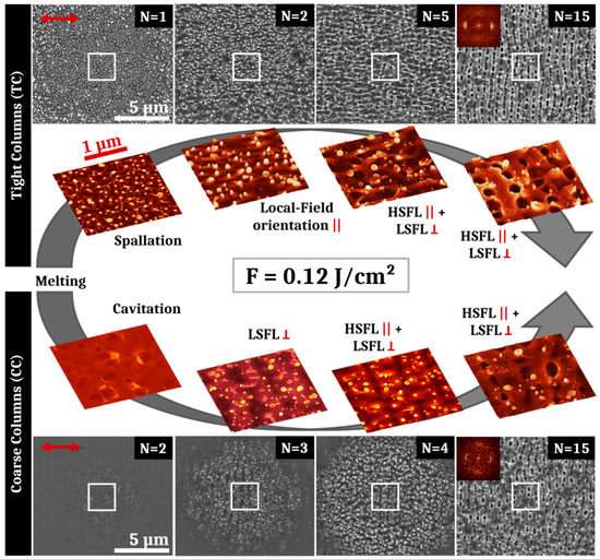 For several decades, the femtosecond laser has been considered as a universal one-step procedure allowing the functionalization of solid materials. Benefitting from a high flexibility, ultrashort laser-induced surface nanostructuring has a panel of applications in various domains such as biomedical technologies, nanofluidics, renewable energies or aeronautics, to name a few [1,2,3]. The preparation and structuring of material surfaces on the nanometer scale are of prime importance for the advancement of these applications. The fast and repeated cycles of melting and resolidification upon multiple pulse irradiation progressively build up unique surface morphologies. Main topography features can be dictated by tuning the laser wavelength, polarization states, pulse duration or the fluence conditions, able to statistically promote specific shapes, scales, depths and orientations. These structures can transform or enhance surface properties such as wettability [4,5], mechanical and corrosion behavior, optical properties [3] or tribological performances [6], giving new functionalities to the structured material. More specifically, laser-induced periodic surface structures (LIPSS) with various characteristics can be generated on transparent materials, semi-conductors or metals [7,8]. For laser–metal interaction, several class of micro- and nano-structures are classically encountered. Formed near the ablation fluence regime, low spatial frequency LIPSS (LSFL) exhibit a periodicity marginally lower than the laser wavelength λ. LSFL are perpendicular to the electric field polarization, and are triggered by the interference of the incident light with the radiative scattered fields from laser-induced surface heterogeneities as bumps, holes or nanoparticles. Parallel or perpendicular to the laser polarization, high spatial frequency LIPSS (HSFL) have a period lower than λ/2 and are strongly suspected to be initiated by local field enhancement on nanoreliefs whereas their growth is sustained by hydrodynamic mechanisms [9]. They are often categorized according to features depending on their localization and their orientation parallel or perpendicular to the polarization [10]. Parallel to the polarization and with a periodicity Λ > λ, a groove-like structures can also be generated on metals by high feedback femtosecond laser irradiation [11]. Finally, nanocavities or nanobumps were recently disclosed on the nanoscale with original hexagonal symmetries [9,12,13,14].