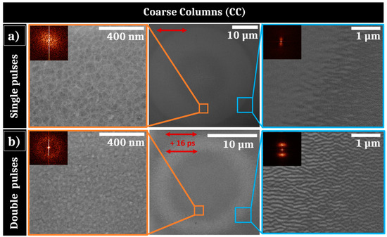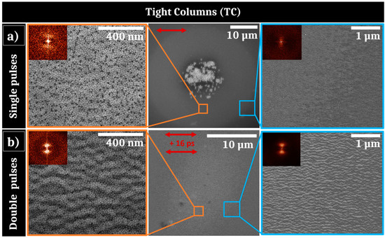 Using a low fluence of 0.06 J/cm2 with single pulses experiments, the samples are submitted to a sub-ablation regime promoting solid–liquid phase transition that may involve hydrodynamic instabilities due to a capillary process [9]. These instabilities are correlated to time-dependent liquid properties that can be extended using a collinear double pulses approach [9]. Therefore, a second set of irradiations were done at the same fluence of 0.06 J/cm2 in a double pulse configuration, with an equally distributed fluence in each arm, with an elevated number of pulses in order to enhance the feedback. Figure 5 shows comparatively the results obtained for both 50 single-pulse and 50 double-pulse sequences. For single pulses (Figure 5a), the TC sample exhibits a reduced zone where low spatial frequency LIPSS are formed at the center of the irradiation area. Two zooms at remote locations surrounding the LSFL are presented in the Figure 5a (left and right) with their respective 2D-Fourier transform (2D-FT) as insets. On the border of the observed laser impact area, weakly contrasted nanostructures are present. They consist of periodic arrangement of material, parallel to the polarization, with a period approximately equal to 100 nm. These periodic structures are only observed at the outside region of the Gaussian energy distribution and their contrast is similar to structures associated to annealing mechanisms [13,30]. In addition, in the intermediate region between these structures and the impact center, highly-concentrated dark contrasted points are visible at the interstices of the initial columnar morphology. These dark points indicate the presence of cavitation-induced gaps between the columns. Low contrasted wavy patterns, confirmed by vertical bright dots in the 2D-Fourier transform, reveal the starting of HSFL generation that preserve the microstructural morphology.