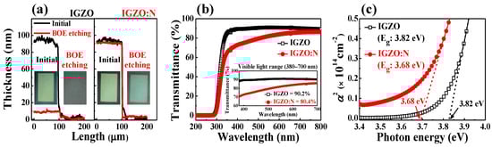 To investigate the effects of microwave-assisted nitridation on solution-derived IGZO nanocomposites, the IGZO and IGZO:N films that were formed on the p-type Si substrate were dipped in a buffered-oxide-etch (BOE; 30:1) solution for 30 s. In Figure 2a, the IGZO film was etched by the BOE treatment and the thickness of the initial IGZO film decreased. On the other hand, the IGZO:N film was not etched by BOE treatment, which indicates the difference in the chemical compositions of IGZO and IGZO:N nanocomposites. Figure 2b represents the optical transmittance spectra of the IGZO and IGZO:N films that were formed on the glass substrate (7059 glass; Corning Inc., New York, NY, USA). The inset depicts the optical transmittance at the visible-light wavelength (400–700 nm) region and the average transmittance values. The average optical transmittances of IGZO and IGZO:N films at the visible-light wavelength region were 90.2 and 80.4%, respectively. The optical absorption coefficients (α) of IGZO and IGZO:N films that were calculated from the transmittance spectra are represented in Figure 2c. The absorption coefficients were extracted from the ultraviolet wavelength region of optical transmittance spectra and were calculated by the following equation neglecting the reflection coefficient []: