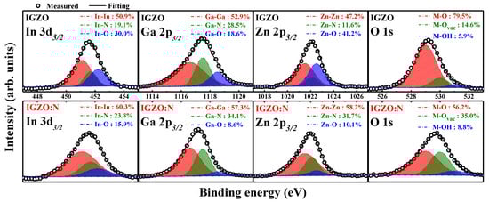 Figure 3 shows the chemical compositions of IGZO and IGZO:N nanocomposites through the XPS spectra evaluations. The XPS spectra were measured after the surface was etched with Ar+ ion-etching for 1 min, in order to analyze the chemical compositions by avoiding any surface contamination. To investigate the microwave-assisted nitridation effects on solution-derived IGZO nanocomposites, each metal species was deconvoluted into three individual component peaks: metal–metal bonds, metal–nitrogen bonds, and metal–oxygen bonds. In addition, the O 1s peak was also deconvoluted into the stoichiometric oxygen (M-O) bonds, oxygen-vacancies (M-Ovac) bonds, and oxygen impurities (M-OH) bonds such as H2O, CO3, or chemisorbed oxygen [].