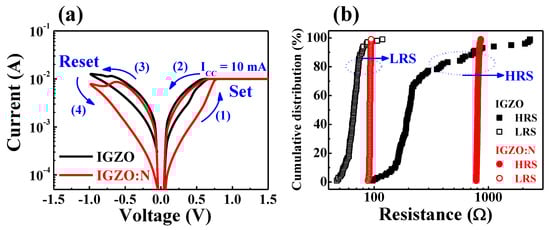 (a) Bipolar resistive switching (BRS) I–V characteristic curves and (b) cumulative resistance distribution under 102 sequential DC cycles of the IGZO and IGZO:N memristor devices.