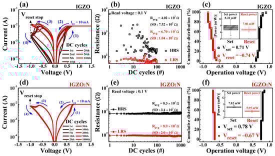BRS endurance characteristics for (a–c) IGZO memristors and (d–f) IGZO:N memristors: (a,d) BRS I–V characteristic curves. (b,e) The resistance values of HRS and LRS extracted at a read voltage of 0.1 V. (c,f) Cumulative distribution of set and reset voltages. Insets indicate the calculated operation power for the set and reset processes.