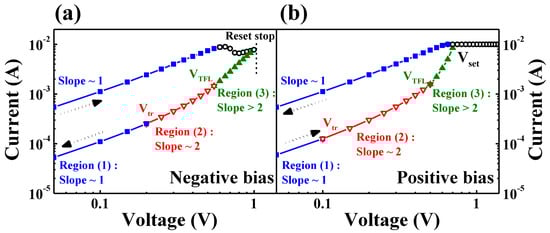 To investigate the current conduction mechanism for IGZO:N memristor devices, the set and reset processes in BRS I–V characteristic curves were analyzed with double-logarithmic plotting and are represented in Figure 6. In the positive and negative bias sections of Figure 6, the HRS in I–V curves can be divided into three distinct regions by a noticeable slope difference: ohmic conduction (I∝V, blue line) in region (1), trap-filled-limited conduction (I∝V2, red line) in region (2), and the trap-controlled space-charge-limited conduction (SCLC) (a steep increase in I, green line) in region (3).