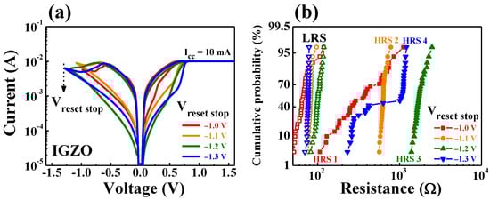Multi-level resistance characteristics for the IGZO memristor devices by varying the magnitude of Vstop values from −1.0 to −1.3 V (in −0.1 V step). (a) BRS I–V characteristic curves. (b) Cumulative probability during 30 cycles of DC BRS operation.