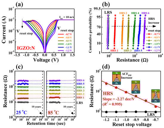 Figure 8c shows the retention characteristics of the multi-level resistance states over 104 s at room temperature (25 °C) and high temperature (85 °C), respectively. All resistance states from LRS to HRS exhibited stable nonvolatile retention characteristics, and they did not degrade under room- or high-temperature conditions. Figure 8d represents the relationship between the average resistance values of HRS and the magnitude of the Vstop value. The average resistance values of the HRS can be modulated with the Vstop value, and they demonstrated a linear relationship with a slope of −2.27 dec/Vstop (R2 = 0.995). Therefore, the highly reliable multi-level characteristics of IGZO:N memristor devices suggest the continuous resistance or conductance controllability in the IGZO:N nanocomposites through electrical stimulations [,].