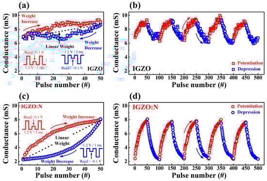 To investigate the gradual conductance modulation according to the electrical pulse stimulations, which is essential for memristive switching, the synaptic weight increase (potentiation) and decrease (depression) properties were evaluated. Based on the multi-level properties and nonvolatility of the RS nanocomposite, the synaptic weight can be modulated by an implementable algorithm for the repetitive learning process. Figure 9a,c show the conductance increase/decrease characteristics for IGZO and IGZO:N memristor devices for one electrical pulse stimulation cycle, respectively. The one cycle consisted of 50 potentiation pulses (1.2 V/1 ms) and 50 depression pulses (−1.2 V/1 ms), respectively, which were identically repeated. Figure 9a shows the IGZO memristor devices, wherein the conductance increased or decreased irregularly with a dynamic range of ~2 mS during one stimulus cycle. Conversely, in Figure 9c (IGZO:N memristor devices), the conductance increased and decreased symmetrically with a dynamic range of ~6 mS during one stimulus cycle. Figure 9b,d depict the weight modulation stability of IGZO and IGZO:N memristor devices for five consecutive stimulus cycles (a total of 5 × 102 synaptic pulses) evaluations. In Figure 9b, the conductance of IGZO memristor devices was unstably modulated as the pulse number increased. However, in Figure 9d, the conductance of IGZO:N memristor devices was symmetrically and stably potentiated/depressed for the repeated synaptic pulse numbers. As a result, based on the reliable multi-level properties and stable nonvolatility of the IGZO:N nanocomposite, the synaptic weight was successfully modulated in IGZO:N memristor devices, indicating the potential applications in artificial synaptic electronics.