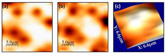 One of the challenges when it comes to developing 2G-HTS tapes is to understand which pinning objects in the superconducting film are dominating any increase in the critical current. SEM images of these SuNAM tapes reveal both a high density of quite uniformly dispersed multilayer Gd2O3 inclusions with a wide range of orientations throughout the superconducting layer and much larger CuOz outgrowths on the top surface, as shown in Figure 1b [18,19]. Since the latter tend to have much larger lateral dimensions and are also non-superconducting, it is important to rule out that these are not also contributing significantly to the pinning of superconducting vortices. Due to their very large size compared to the superconducting coherence length, we expect these to behave as 3D pinning sites at medium to high magnetic fields. As these features are found at the tape surface, they represent the main contribution to the surface topography and can be mapped using the “gating” imaging approach described in Section 2. In this way, we can search for correlations between the location of the CuOz outgrowths and the locations of strongly pinned vortices. Figure 7a shows examples of topographic maps that were captured just after the magnetic maps of Figure 7b (measured with a normal sample bias of 0.2 V). Comparing the pairs of images, we are unable to find any significant correlation between the largest topographical features and the characteristic vortex pinning locations. As clearly seen in the linescans plotted in Figure 7c, the vortex centres do not appear to bear any relationship with the measured topographic peaks (or troughs), something that has been confirmed by generating a numerical cross-correlation of the image pairs. Hence, we consider it very unlikely that these non-superconducting CuOz components make a significant contribution to the vortex pinning landscape, and they are hence inactive in the measurement regimes we explore. Instead, everything points to the fact that the Gd2O3 nanoparticles distributed throughout the superconducting layer play the dominant role in maximising Jc.