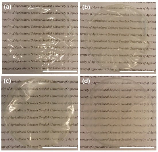 Photographs of the newly synthesized materials. Bright areas are light reflections. (a) CNF_PEG, (b) CNF_PEG_TiO2, (c) CNF_PEG_Captigel, and (d) CNF_PEG_TiBALDH. Scale bars indicate 4 cm.