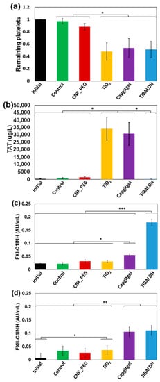Assessment of coagulation activation induced by the test surfaces (CNF_PEG_TiO2, CNF_PEG_Captigel, and CNF_PEG_TiBALDH, abbreviated to TiO2, Captigel, and TiBALDH, respectively, in the figure) and the controls (CHS and CNF_PEG) compared to the initial samples after incubation in human whole blood. (a) Remaining platelets (n = 5), (b) generation of TAT-complexes (n = 5). (c) Formation of FXIa–C1INH complexes (n = 3) and (d) of FXIIa–C1INH complexes (n = 3). Data are presented as mean ± SEM. The data in (a) were normalized against the initial values for each donor. * Significant at p < 0.05 level, ** significant at p < 0.01 level, *** significant at p < 0.001 level.