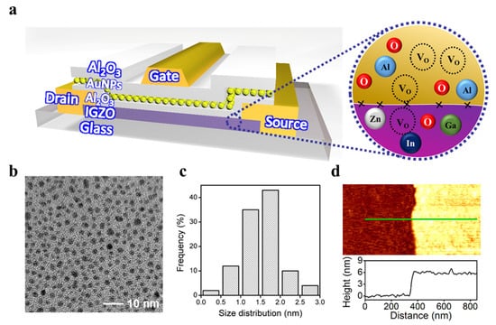 Particularly, NVM devices based on TFT structure have been strongly studied for optimizing excellent memory performances through various device configurations but remain challenging to acquire stable and reliable memory properties due to unfavorable processing techniques. Furthermore, the NVM device in modern technology aims to assimilate a long-life storage capability with a large memory window over a small voltage range through favorable and simple processing techniques. Our design and favorable processing technique of the proposed NVM device attempt to overcome the existing limitations of the low-temperature process by defining the top control gate structure type flash memory device, which has a great potential to obtain a large memory window and stable endurance/retention operations. The entire proposed NVM device stack based on IGZO channel material with a floating gate layer of Au nanoparticles is elaborated in Figure 1a, distinguishing the IGZO film and tunneling layer of Al2O3 as shown in the inset. Recent studies of flash memory devices show that the floating gate layer, specifically nanoparticles, is capable of impressive charge storage capacity due to its strong coupling effect with channel material, higher space for charge storing nodes, and a favorable state-of-the-art process forming nanoparticles film. Here, the AuNPs monolayer film, used as a floating gate layer, is prepared by the interfacial assembly of AuNPs [41]. Figure 1b presents a transmission electron microscopy (TEM) image, revealing a monolayer of AuNPs film without multiple stacking and spatial separation from each other. The size of the most constituent AuNPs is less than 3 nm as shown in Figure 1c. The thickness of the monolayer AuNPs, which includes a ligand shell, is measured to be 5.5 nm using atomic force microscopy (AFM), shown in Figure 1d.