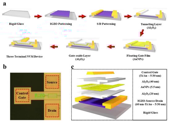 Figure 3. NVM device based on stacking of IGZO/Al2O3/AuNPs/Al2O3 layers. (a) A sequential fabrication process of the proposed NVM devices. (b) An optical image of the proposed NVM device. (c) A layer-by-layer schematic layout of the proposed NVM device along with each thickness information.
