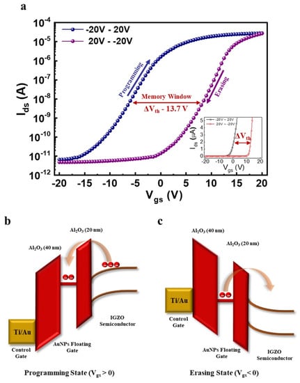 After fabrication of the proposed three-terminal NVM device, its electrical transfer characteristics are measured to observe the storage capability, where the voltage sweep is applied from −20 V to +20 V and back to −20 V at Vds of 1 V as shown in Figure 4a. A large memory window (ΔVth) of 13.7 V is observed over a preferable range of applied voltage (−20 V to +20 V), principally initiated from a large amount of charge carriers stored in the AuNPs floating gate layer. Furthermore, the inset of Figure 4a explains the linear scale transfer curve of the proposed three-terminal NVM device, defining the clear threshold voltage difference (ΔVth) of programming and erasing state. The following three-terminal NVM device characteristics are extracted in case of forward bias (−20 V to +20 V), Vth of −4.5 V, and Ion/Ioff of 106, revealing excellent transfer properties of the proposed IGZO-based NVM device. Furthermore, a comparison table of the proposed NVM device with the previously reported flash memory devices based on IGZO semiconductor material is demonstrated in Table 1, distinguished as following benchmark parameters such as gate stack, channel deposition method, memory window (ΔVth), and applied voltage range, revealing a large memory window over a small preferable voltage range (−20 V to +20 V) with easy processing methods. The proposed three-terminal NVM device memory operation is illustrated in the form of a band diagram, shown in Figure 4b,c, in case of programming and erasing states, respectively. When the control gate voltage (Vgs) is swept from the negative voltage to the positive voltage, electrons can tunnel through the tunneling layer of Al2O3 (20 nm) as per the Fowler-Nordheim tunneling effect [7,42,43]. This way, the charge stored in the floating gate layer will shift the threshold voltage (Vth) and result in a programming state (Figure 4b). When the control gate voltage (Vgs) is swept from the positive voltage to the negative voltage, electrons can discharge and tunnel back to the IGZO channel, resulting in an erasing state (Figure 4c).