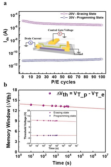 44. Jang, J.; Park, J.C.; Kong, D.; Kim, D.M.; Lee, J.S.; Sohn, B.H.; Cho, I.H.; Kim, D.H. Endurance characteristics of amorphous-InGaZnO transparent flash memory with gold nanocrystal storage layer. IEEE Trans. Electron Devices 2011, 58, 3940–3947. [Google Scholar] [CrossRef]