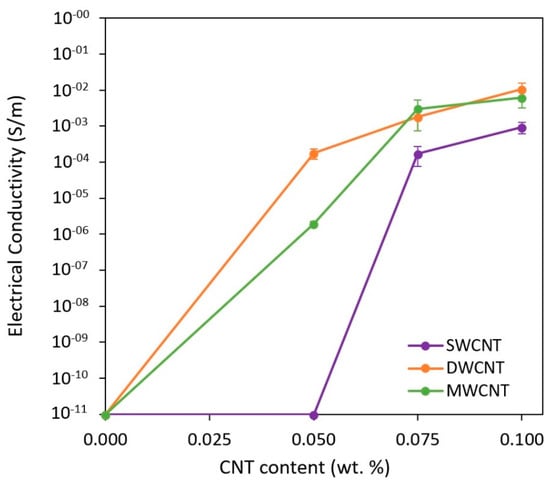 Electrical conductivity values of nanocomposites doped with different CNT types— SWCNTs, DWCNTs and MWCNTs—are summarized in Figure 2. Here, several interesting factors can be observed. The electrical percolation threshold is different as a function of CNT geometry: below 0.050, around 0.050 and 0.075 wt. for nanocomposites doped with DWCNT, MWCNT and SWCNT, respectively. In addition, the final electrical conductivity of the nanocomposites at a higher CNT content where the electrical network is saturated is lower for the nanocomposites doped with SWCNTs.