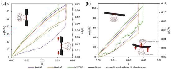 Examples of electromechanical tests for specimens doped with 0.1 wt.% CNTs in tensile (a) and three-point bending (b) load conditions.