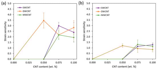 Strain sensitivity as a function of CNT content under tensile (a) and bending (b) load conditions.