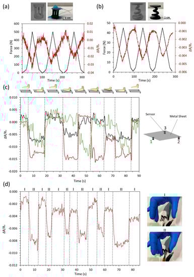 Self-sensing printed complex devices: (a) cycling compression load of the three-column device, (b) cycling compression load of the spring, (c) footstep platform and (d) manual compression of spring device.