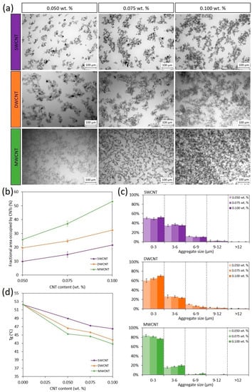 The poor dispersions obtained for the samples doped with SWCNTs and DWCNTs are enhanced when increasing CNT content by decreasing the aggregate size. This can be explained by the effectiveness of three-roll milling method. It is widely known that, for the calendering process, a higher viscosity of the mixture allows for obtaining a better dispersion since the shear forces applied to the CNT aggregates are more effective [,]. On the other hand, in the case of MWCNT mixtures, which are already well dispersed even for the lowest content, an increase in the CNT content slightly increases the aggregate size [].