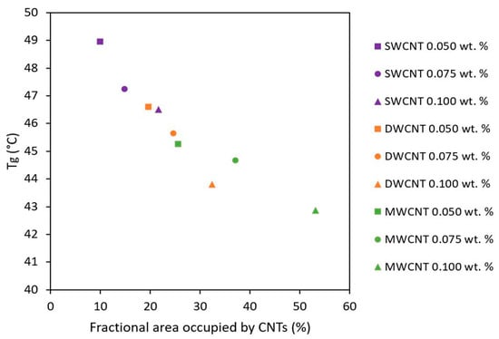 Figure 7 confirms that there is a direct correlation between the Tg values of nanocomposites and the fractional area occupied by CNTs. The samples with a higher dispersion degree, measured by a higher percentage of area occupied by CNTs, present lower Tg values due to the hindering of the photocuring reaction. Therefore, this confirms that the CNTs’ geometry has an important influence on their dispersion, and this significantly affects the crosslinking degree for photocured resins. In this context, it is confirmed that the analysis of the CNT dispersion is essential in these systems to explain the final properties of nanocomposites. In this work, an easy experimental procedure, based on an image analysis of TOM micrographs, has been optimized to determine quantitatively the quality of CNT dispersions.