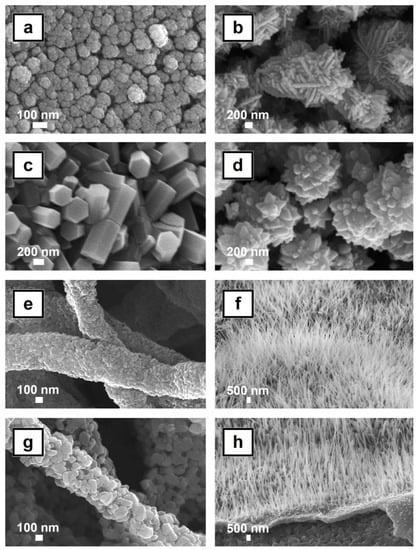 - Preda, N.; Enculescu, M.; Florica, C.; Costas, A.; Evanghelidis, A.; Matei, E.; Enculescu, I. Morphology-controlled synthesis of ZnO structures by a simple wet chemical method. Dig. J. Nanomater. Biostruct. 2013, 8, 159–600. [Google Scholar]