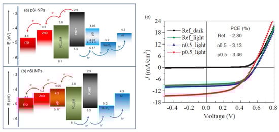 | ITO/PEDOT:PSS:Si/MEH-PPV:PCBM/Al | Regular | ABL | 2.46 | 2.24 | 2014 | [97] |