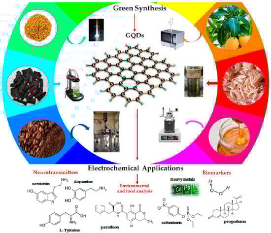In this section, the significant recent advances in the design of GQDs by eco-friendly synthetic routes [20,87], from biomass waste or other green raw materials, for the development of electrochemical sensors are summarized, with a comparative and balanced discussion (Table 2).