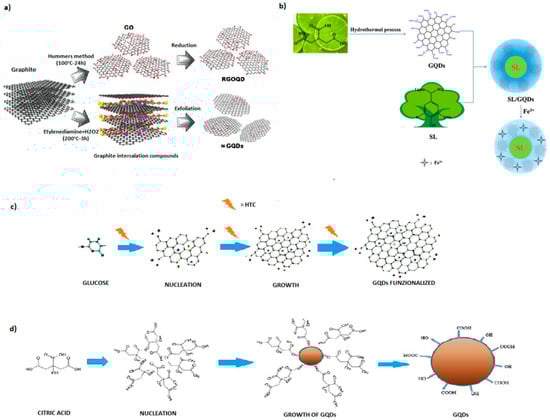 Four green approaches adopted to prepare GQDs. (a) Illustration of the preparative strategy for N-GQDs by electrochemical exfoliation and RGOQDs from GO with Hummers method. (Adapted with the permission of Ref. [46]). (b) Synthetic one-step process for the production of SL/GQDs used as sensing platform for Fe3+ detection by Xu et al. (Adapted with the permission of Ref. [64]). (c) The hydrothermal strategy for the functionalization of GQDs synthetized from glucose. (d) Schematic representation of the nucleation and growth of GQDs obtained from citric acid.