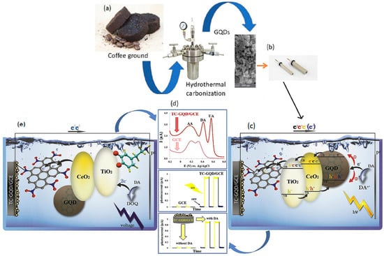 Electrochemical and photo electrochemical detection of dopamine on titania–ceria–graphene quantum dots nanocomposite. (a) GQD synthesis by hydrothermal carbonization process; (b) Fabrication of the EC and PEC electrodes by modification with the TC-GQD; (c) Schematic representation of the EC electron transfer mechanism at TC-GQD/GCE in the presence of DA; (d) Differential pulse voltammetry (DPV) of TC-GQD/GCE and photocurrent responses of the TC-GQD/GCE; (e) Schematic representation of the PEC electron transfer mechanism at TCGQD/GCE in the presence of DA. Adapted with the permission of Ref. [127].