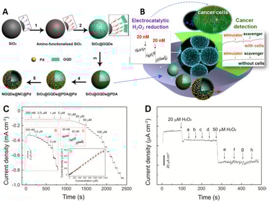 The relevance of electrochemical sensors for biomonitoring and biomarker analysis in environmental, industrial, agricultural, and above all clinical applications is increasingly being documented. In particular, in clinical scenarios, electrochemical sensing tools have been helpful in personalized medicine and minimally invasive diagnostic applications. Hydrogen peroxide (H2O2) can be considered one of the most frequent side products of reactions by oxidase in mitochondria, and can be used as a suitable biomarker for an early diagnosis of many types of cancer, since its adequate level in the human body plays a fundamental role in the control of living cells. As portrayed in Figure 4, Xi et al. proposed a useful amperometric sensor for the detection of hydrogen peroxide, using nitrogen-doped GQD (NGQD) grafted with Pd nanoparticles and encapsulated in carbon nanospheres to realize a hybrid material (NGQD@NC@Pd HNS). The combination of NCHNS, serving as electronically conductive catalyst support able to diminish ohmic resistance, and highly dispersed NGQD and Pd nanoparticles promote electron transfer as well as electro-catalytic activity for H2O2, resulting in a high-performance sensor, with a linear detection range up to 1.4 mM and low detection limit of 20 nM. Moreover, the GQD@NC@Pd/GCE sensor showed a high selectivity to H2O2, evidenced by anti-interference ability, without detectable amperometric responses in the presence of several electroactive interfering compounds, such as dopamine (DA), ascorbic acid (AA) and uric acid [105].