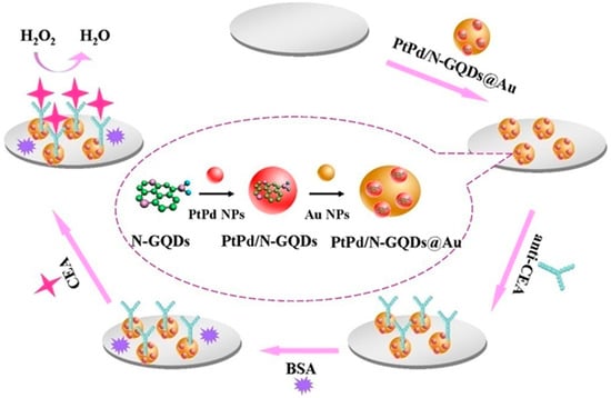 Schematic representation of the label-free electrochemical immunosensor and the preparation procedure of PtPd/N-GQDs@Au for the detection of carcinoembryonic antigen (CEA). Adapted with the permission of Ref. [107].