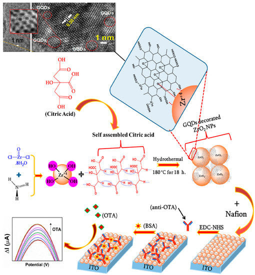 Recently, Ghiasi et al. in 2020 developed an electrode for the organophosphorus pesticides (e.g., diazinon) detection. An activated glassy carbon electrode doped with GQDs (synthesized by citric acid pyrolysis), chitosan, and nickel molybdate nanoparticles (NMO/GQDs/CS/GCEox) coupled with a mini-tab software was used for the first time with the Taguchi method to find the best experimental conditions. By using DPV analysis, the sensor showed good selectivity and a linear range of 0.1–330 μM towards diazinon, with an increment of the current signal due to the amount of diazinon deposited on the electrode [122]. Detection of toxins that can contaminate various foodstuffs also plays an important role in food analyses. In 2018, Shadjou et al. proposed a new sensor for the determination of the M1 aflatoxin (AFM1), a vegetable food contaminant, e.g., in cereals. The electrochemical sensor was created through a multilayer film of GQDs, derived from citric acid pyrolysis, α-cyclodextrin, and silver deposited on a glassy carbon electrode (GQDs-α-CD-AgNPs). The study of the sensor response on the samples was performed by CV analysis demonstrating a linear range of 0.015 mM–25 mM [123]. Gupta et al. in 2020 presented a viable method for the detection of ochratoxin-A (OTA) by electrochemical biosensing. According to Figure 7, the biosensor was constructed with GQDs from citric acid, doped with zirconia nanoparticles (GQDs@ZrO2). A morphological study by TEM analysis clearly shows the existence of GQDs with lattice spacing values of 0.28 and 0.30 nm in the m(111) and t(101) planes of ZrO2 NPs. On their superficies, in fact, it is possible to see hexagons of carbon atoms of the GQDs. This system allowed electrons to move rapidly through the nanocomposite and prevented aggregation of GQDs by increasing the availability of their functional groups. This turns out to be relevant for antibody binding to the electrode. The BSA/anti-OTA/GQDs@ZrO2/ITO biosensor through CV and DPV analysis provided a sensitivity of 5.62 μA mL/ng cm2 and excellent stability and sensitivity toward ochratoxin-A [124].