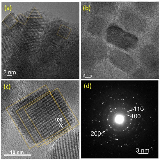 High-magnification TEM images of the prepared nano-BTO powders are presented in Figure 1 at different dispersion stages, since sample preparation is crucial in TEM analysis. For instance, when powders were not completely dispersed in cyclohexane (see Figure 1a BTO-18h sample), one can distinguish particles with smooth sides, which join at 90°. In addition to cubic or rectangular shapes, triangular shapes can also be observed. The triangular shapes are probably truncated cubes, with corners cut with {111} planes which can become at the limit octahedrons, bordered only by {111} faces. The elongated particles are presumable edge-cut cubes, with the planes {110} up. Unfortunately, these images do not allow size measurements because of shadows caused by the overlapping grains. When the particles are well dispersed in cyclohexane, the faces are no longer smooth, and no sharp edges and corners can be seen (see Figure 1b). This suggests that the crystallites are damaged during the dispersion process. This can be well seen in Figure 1c, showing almost completely dispersed particles for the BTO-3h sample. This image allowed us to observe that the interplanar spacing parallel to the cube sides corresponds to the {100} planes of the cubic BTO structure. The SAED analysis also confirmed the cubic structure of the BTO crystallites (see Figure 1d). The particle lengths found by TEM for both samples were about 15–20 nm.