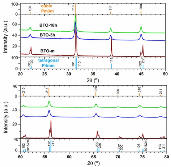 The XRD phase identification showed that both prepared nano-BTO samples matched the cubic perovskite structure, space group Pm3m, whereas BTO-m is tetragonal, space group P4mm (see Figure 2). The diffractograms are represented in two panels for the visualization of the tetragonal line splits. The intensity scales are lower at the high-angle panel to allow the visualization of the small-intensity peaks at higher angles.
