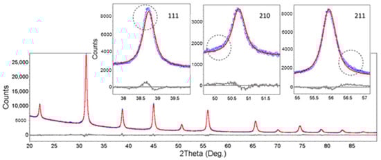 The small deviations, shown in Figure 3, of the calculated peak profiles from the experimental ones, indicate that the real structure differs from the assumed model. We propose the following major reasons for the observed deviations: the crystal lattice symmetry, which is different from the cubic one, and the microstructure anisotropy, i.e., crystallographic direction-dependent crystallite size and microstrain.