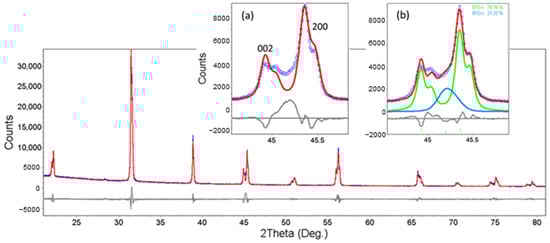 For BTO-m, the fit is much worse, especially due to the increased intensity between the close tetragonal lines (Figure 4, inset a). As we intended to include BTO-m in the study only as a reference mainly for the lattice parameters, the fitting focused on matching the tetragonal lines’ positions as accurately as possible. This type of fitting was the basis of the results presented in the tables and graphs below. However, according to a simplified core-shell model (without the “gradient lattice strain layer” proposed by Hoshina et al. []), the tetragonal structure is surrounded by a shell with a cubic structure. By adding a cubic BTO phase, the matching becomes better (Figure 4, inset b). The concentration of the cubic phase is estimated at 21–22% by quantitative Rietveld analysis, and the cubic lattice parameter is a = 4.009 Å.