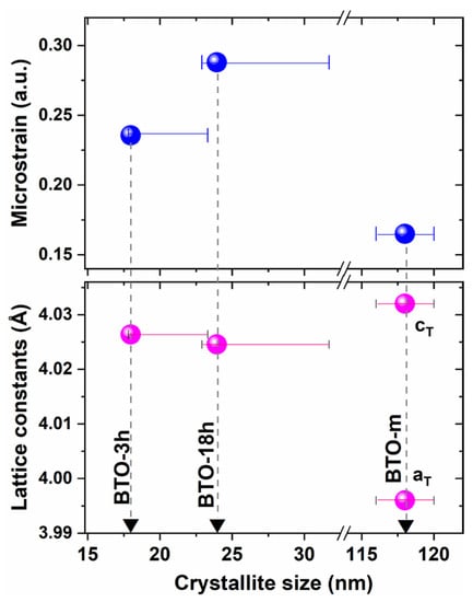 Summarizing the results, the prepared nano-BTO samples were constituted of crystallites with average sizes of about 18 nm for BTO-3h and 24 nm for BTO-18h, as a function of the reaction time, and both can be considered as having cubic lattices with large microstrain. The microstrain may originate, for example, from the different structure of the crystallite boundary or inclusions in the lattice []. The commercial BTO powder, declared to be micrometric (BTO-m), has a tetragonal structure, therefore it is in a ferroelectric state. For ferroelectrics, the coherence length is determined by the ferroelectric domain sizes. The local lattice distortion, expressed by the quantity “microstrain”, was found to be quite large for the tetragonal phase of this powder (for well crystallized powders, applying the same software and fitting procedure, this parameter is commonly found to be at least 10 times smaller). This relationship might be expected, given that this single tetragonal structure also approximates the gradient lattice strain supposed by the surface relaxation or the core-shell model, which are discussed below.