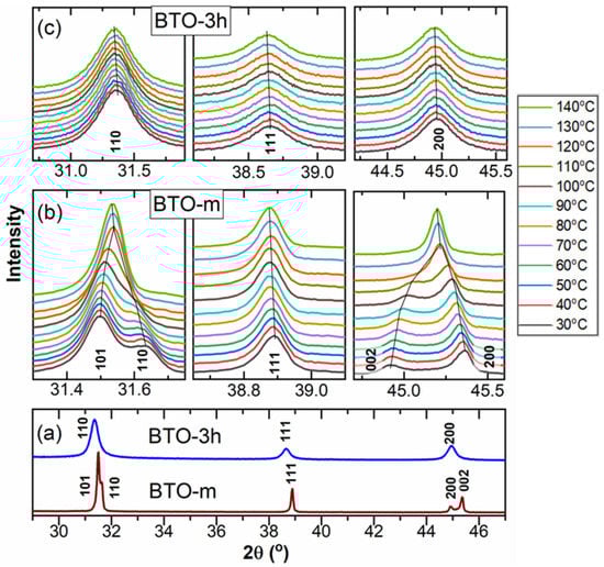 XRD measurements at temperatures from room temperature up to 140 °C for the nano-powders (exemplified by BTO-3h) and for BTO-m are presented in Figure 6. At room temperature, the diffractograms look very different (Figure 6a) but become similar at 140 °C. In the case of the BTO-m sample, the tetragonal splitting decreases with temperature, until the two lines merge, marking the phase transition, at approximately 120 °C (Figure 6b). The peaks of the nano-BTO samples do not show noticeable changes with temperature, except for a slight shift to small angles caused by the thermal expansion (Figure 6c).