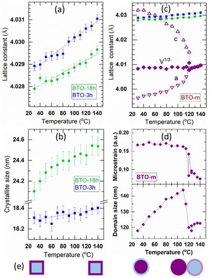 Figure 7b shows that the increase in crystallite size is insignificant for the nano-BTO samples (at most 4 Å, of which almost 10% is thermal expansion, and the rest is probably due to the ordering of the atoms at the boundary). In the case of BTO-m, the situation is completely different (see Figure 7d). The coherence domains (which are the ferroelectric domains in the case of ferroelectrics) increase up to the transition temperature by about 20 nm and, shortly before the phase transition, decrease suddenly to approximately their initial size. The lattice strain also decreases sharply close to the transition temperature. Assuming that the crystallites are single ferroelectric domains (in the case of BTO, 120 nm is about the upper limit of the crystallite size that develops a single ferroelectric domain []), we propose the following scenario to explain this behavior: As the temperature increases, and the tetragonality of the tetragonal core structure reduces, it gradually embeds the surrounding cubic shell (this is supported by the fact that in the cubic shell, there is probably a gradient of tetragonality decreasing towards the surface), until the core and the whole shell become a single coherence domain, with a structure very close to the cubic one. In the core-shell model for BTO, the shell thickness has been estimated at different values, from 5 nm [] to about 10–15 nm [], the thickness being independent of the size of the crystallites. In our case, the increase in the coherence length by about 20 nm indicates a thickness of 10 nm at each opposite side, a value that falls within the range of the shell thicknesses reported in these references. Therefore, the increase in the coherence length with temperature could be explained in the way presented above. The transition begins due to the occurrence of cubic-BTO nuclei of the size of a couple of unit cells near the crystal surface []. From the point of view of XRD, this leads to the destruction of the coherence of the surface structure, and therefore to the decrease in the size of the coherence domain. Upon heating, the transition occurs in the whole volume. Given that the coherence domain decreases, we can speculate that the shell’s fragmented structure transforms more slowly. This outer structure may contain the nanometer size domains revealed for the first time by TEM studies in 1984 by Bursill and Lin. []. This intermediate form between the tetragonal and cubic structure of BTO has a sharp onset temperature and occurs over a range of temperatures, being quite stable up to 140 °C. A short-range order structure occurring around the phase transition, which deviates from the average structure of BTO, has also been demonstrated by X-ray topography [] and XRD pair distribution function analysis []. The evolution of the crystallite size suggested by our experimental results is sketched in Figure 7e. This tentative interpretation needs further confirmation by dedicated studies.