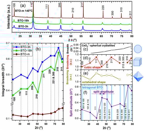 (a) The XRD patterns of the nano-powders compared with BTO-m in cubic phase at 140 °C (the Kα2 contribution has been removed and the patterns are shifted vertically); (b) the integral widths of the nano-powders and of BTO-m at 140 °C as a function of Miller indices; (c) line broadening due to isotropic microstructure; (d,e) theoretical line broadening caused by cubic and octahedral external shapes, respectively, according to Table 3; (f) tetragonal split amplitude.