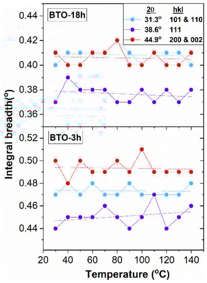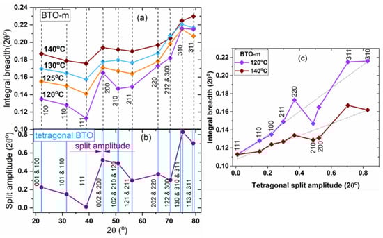 The XRD pattern of BTO-m recorded at 140 °C is presented comparatively to the patterns of nano-BTO powders at room temperature in Figure 8a, and the peak widths as a function of line positions and of the Miller indices are represented in Figure 8b. It can be observed that the widths are strongly hkl-dependent and it is remarkable that the variation follows the same pattern for both nano-BTO samples. Unexpectedly, one can also notice an hkl dependence for BTO-m at 140 °C.