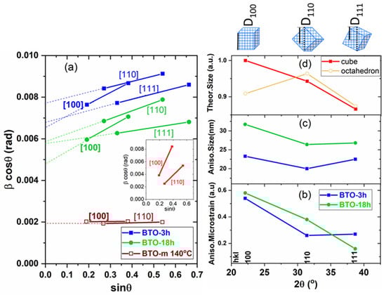 One can observe that for both nano-BTO samples, the slopes of the plots corresponding to the [100] crystallographic direction are clearly larger than for the other two directions, indicating a larger microstrain in this direction. One should note that the possible tetragonal split can also play an important role in determining the slopes of the lines, leading to false values of microstrain. This is illustrated in the inset of Figure 10a. The plots in this inset were obtained considering that the integral breadths of the peaks are equal to the split amplitudes represented in Figure 8f. Although this assumption is exaggerated, the plots indicate that the results obtained using the Williamson–Hall method should be treated with caution if tetragonal splitting is possible. In addition to the nano-powders, we also applied this method to BTO-m at 140 °C, where it is in the cubic phase. In this case, the slopes were almost zero, indicating a much smaller microstrain compared to the nano-BTO samples. The y-intercept and the slope of the line drawn by two points were determined by “linear fit”, and the results are presented in Table 4 and are graphically depicted in Figure 10b,c. The variation of crystallite sizes as a function of the crystallographic direction is compared with the variation of the theoretical sizes (the average column lengths) for cubic and octahedral crystallites, represented in Figure 10d. These values were calculated as the reciprocal of the values listed in Table 3. One can see that the dependence of sizes on hkl roughly agrees with the theoretical one for cubic crystallites and does not correlate with the plot corresponding to octahedral crystallites. This could be a confirmation of the predominant cubic shape of the crystallites. It is worth notice that the cube side (D100) is larger than the average sizes obtained by Pawley fitting supposing isotropic crystallite sizes. This is because the microstrain is the greatest perpendicular to the cube faces. We also included these values in Table 1 and Figure 5.