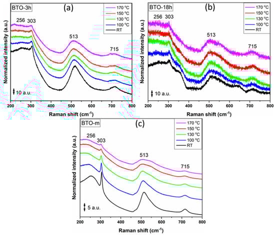 Raman spectroscopy was used to characterize the local structural distortions existing in the nano-BTO prepared (BTO-3h and BTO-18h) and BTO-m samples. The temperature-dependent Raman spectra of the studied BTO nanocrystals are depicted in Figure 12.