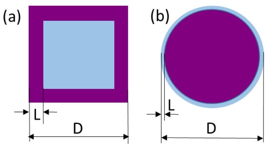 Sketches of the crystallites in the core-shell model; (a) nano-BTO, (b) BTO-m; blue—cubic phase, purple—tetragonal phase.