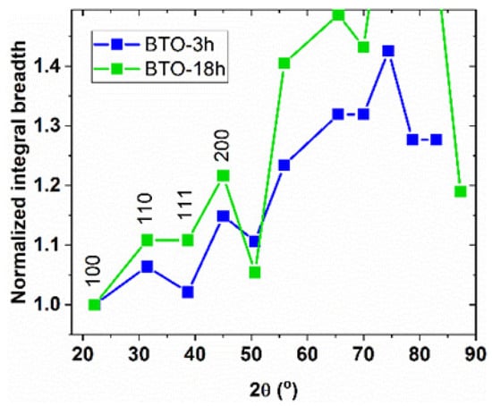 In the case of nano-BTO crystallites with D = 18 nm (sample BTO-3h) and D = 24 nm (sample BTO-18h), one obtains that the tetragonal phase (shell) volume percentage is 77% and 64%, respectively. Hence, the tetragonally deformed structure should be considerably abundant in these samples and more in BTO-3h than in BTO-18h. As we stated above, the tetragonal imprint can be assigned to the narrow 111 line, which is a single peak in the tetragonal phase, compared to neighboring peaks 110 and 200, split in the tetragonal phase. Figure 8a suggests that the tetragonal imprint is stronger for BTO-3h than for BTO-18h, but it is more correct to compare the relative line breadths of the two samples, as represented in Figure 14, in which the peak widths were normalized to the width of the 100 peak. These graphs clearly show that the tetragonal imprint is stronger for the smaller-sized BTO. The fact that the contribution of the tetragonally deformed surface structure increases with the size decrease is in agreement with the trend of increasing distortion in Ba-Ti distances and titanium off-centering with decreasing particle size, as established by Smith et al. [].