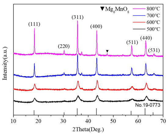 X-ray powder diffraction was used to identify the phase of the as-synthesized samples. Figure 2 shows the XRD patterns of all the powder samples. As shown in Figure 2, several obvious diffraction peaks appeared in the XRD pattern of the sample annealed at 500 °C, indicating the formation of nanocrystals. The peak intensity increased gradually with the increase in annealing temperature, indicating that the crystallization degree of the sample increased. All the peaks indexed as (111), (220), (311), (400), (511), (440), and (531) crystal planes were assigned to the cubic Mg2MnO4 phase (ICDD PDF#19-0773). When the annealing temperature was up to 800 °C, a new weak impurity peak of Mg6MnO8 (No.19-0766) occurred. The XRD result showed that the pure cubic Mg2MnO4 spinel could be prepared by the sol-gel method when the annealing temperature was 500–700 °C. In addition, based on the XRD data, the cell parameters of the samples were estimated according to the formula: , where h, k, and l are the Miller indices, d is the interplanar spacing, which is obtained by the Bragg equation (). The parameters were 8.285 (±0.001) Å, 8.298 (±0.001) Å, 8.330 (±0.001) Å, and 8.334 (±0.001) Å for the samples annealed at 500–800 °C.