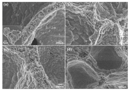 The morphology and particle size of the Mg2MnO4 samples were observed by SEM and TEM, shown in Figure 3 and Figure 4, respectively. From the inset of Figure 3a, it can be seen that the sample annealed at 500 °C had a porous-spongy structure, the samples annealed at 600–800 °C had a similar porous-spongey structure (Supplementary Material, Figure S1). When the magnification was increased, it was found that the structure was assembled by nanoparticles (Figure 3a), and all the annealed samples showed a similar microstructure (Figure 3b–d). It can be seen from Figure 4a,b that the particle size of the samples annealed at 500–600 °C was in the range of 30–50 nm. When the annealing temperature was increased to 700–800 °C, the particles of the sample grew rapidly, and the size was up to 100–200 nm. The high-resolution (HR) TEM image was taken for the particles shown in Figure 4e. The lattice spacing of approximately 0.48 nm corresponded to the d spacing of the (111) crystal plane of the cubic Mg2MnO4. Figure 5 shows the N2 adsorption/desorption isotherms at different annealing temperatures. The specific surface areas of the samples were calculated by the BET method to be 61.04 cm3/g, 34.95 cm3/g, 11.33 cm3/g, and 8.59 cm3/g for the temperatures 500–800 °C, indicating that with the increase in the annealing temperature, the specific surface area decreased because of the increasing particle size, which was confirmed by the TEM results.